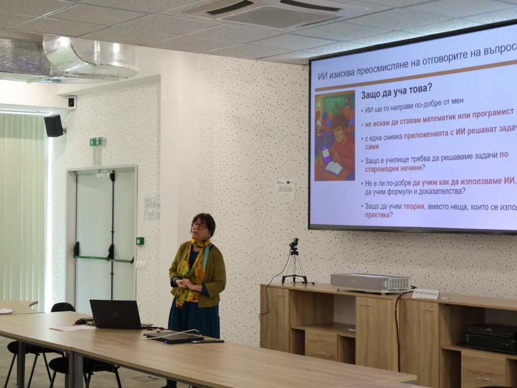 In her presentation Senior Assistant Professor Dr. Albena Antonova touched also on the risks that come with the introduction of AI in the classroom, in mathematics, computer science, IT, and computer modeling education. “To what extent can we trust AI in the educational process? What do we actually learn through it, and when do the results lead to superficial learning? Will AI remain just an experiment, or will it become the education of the future?” These were some of the questions that sparked a lively discussion among teachers. It is well known that artificial intelligence is manipulative, does not admit its mistakes, and causes children in particular to trust it too much.  Interaction between students and AI can lead to tragic incidents as a result of developing an emotional connection. Many of the teachers shared that they are increasingly faced with the challenge of combining new technologies with traditional teaching methods so that students can acquire knowledge in a lasting and mindful way, be critical, and learn to set boundaries.