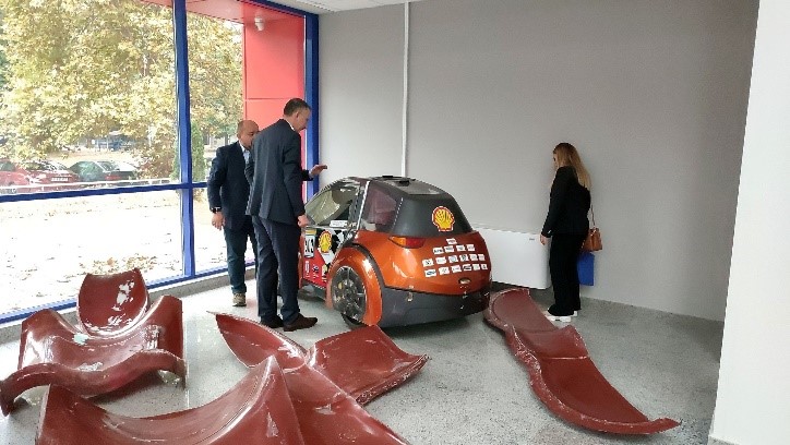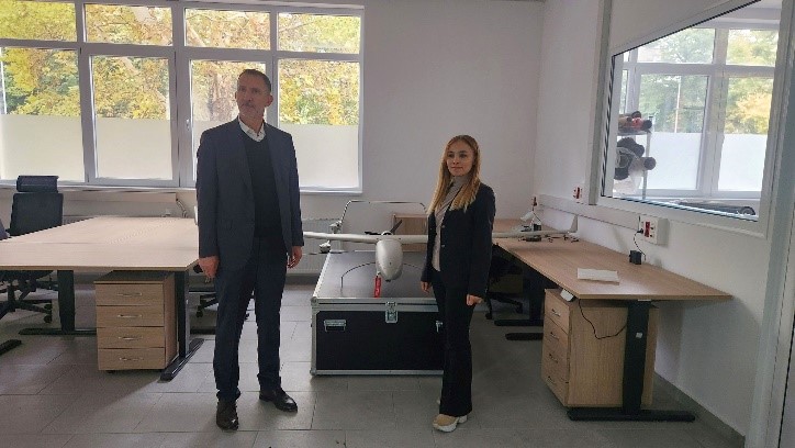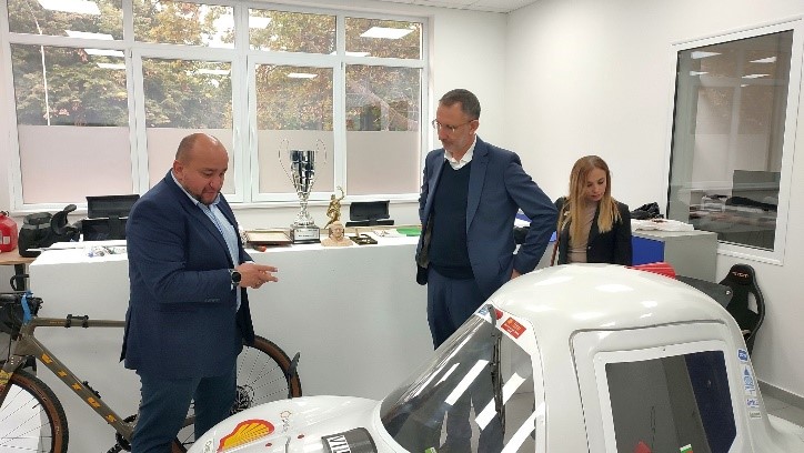 Следващата спирка в програмата за посещение на гостите бе Научноизследователския комплекс на Русенски университет „Ангел Кънчев“, който е изграден по Проект „Русенски изследователски университет“, финансиран от Европейския съюз – NextGenerationEU, чрез Националния план за възстановяване и устойчивост на Република България, по договор BG-RRP-2.013-0001. Там те се запознаха с дейностите на изследователите и учените от лабораториите на НГ 3.1.3. „Интелигентни киберфизични системи и технологии за генериране и визуализация на пространствени обекти и процеси“, с ръководител проф. Георги Христов от Катедра „Телекомуникации“, и НГ 3.1.2. „Устойчива транспортна мобилност“, с ръководител проф. Иван Белоев от Катедра „Транспорт“. В двете лаборатории гостите се запознаха с роботизирани системи, безпилотни летателни апарати, системи за дистанционно наблюдение, електромобили и автомобили с водородни горивни клетки.